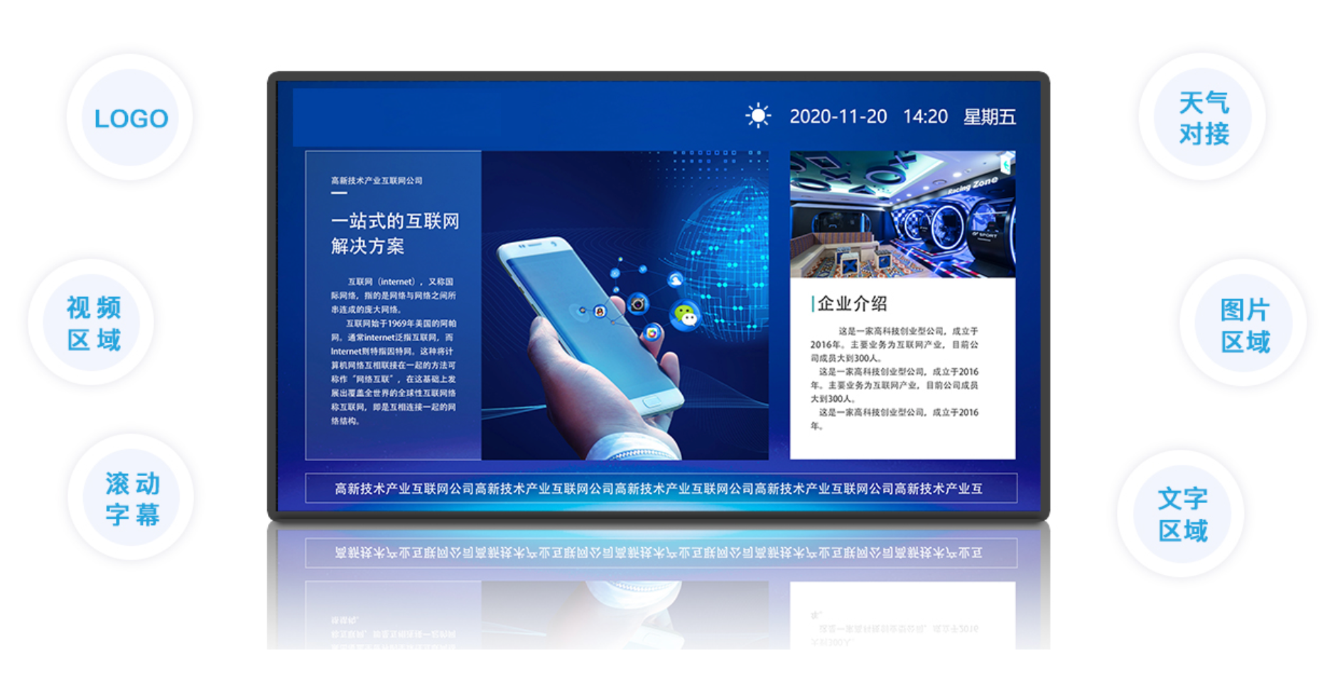 基于CS架构,后台服务器将文字、图片、视频、音频、文档、天气、日期等多媒体元素编辑成普通或者互动节目,通过网络(局域网或者广域网)或者单机拷贝的形式,下发到终端设备,并通过后台服务器对终端设备的节目播放、开关机等功能进行控制。